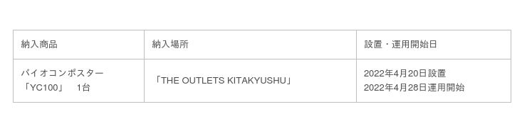 ヤンマーホールディングス株式会社のグループ会社であるヤンマーeスター株式会社(本社:滋賀県米原市、社長:赤澤輝行)は、4月28日にオープンした地域創生型商業施設「THE OUTLETS KITAKYUSHU」(福岡県北九州市)に、食品廃棄物の資源循環を実現するバイオコンポスター「YC100」を納入しました。