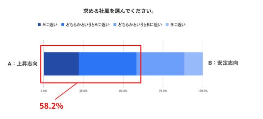 「求める社風」に関する質問では、全体の約6割が「上昇志向に近い」「どちらかというと上昇志向に近い」と回答しました。「働きやすさ」を重視する一方で、仕事を通じた成長も求めていることが明らかになりました。