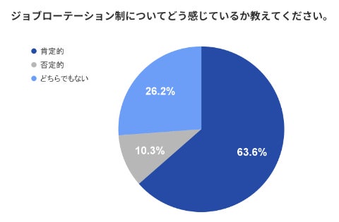 「ジョブローテーション制についてどう感じるか」と尋ねたところ、「肯定的」が63.6%にのぼりました。また、「肯定的」と回答した理由については、「様々な領域を経験して自分の適性を見極めたい」「様々な業務を経験した方が自己成長につながる」といったコメントが見られ、業務を通じて自分に最適な職種や業務を見定めた上で、多様な経験を通じた成長を期待していることがわかりました。