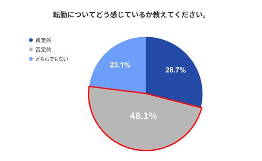 「転勤についてどう感じているか」と尋ねたところ、「否定的」という回答が48.1%と全体の約半数を占める結果となりました。「否定的」と回答した理由については「生活の方が仕事より大事」「ライフスタイルの変化がストレス」など、私生活を重視する価値観や、生活環境が変わることに対する嫌悪感を抱く声が上がりました。