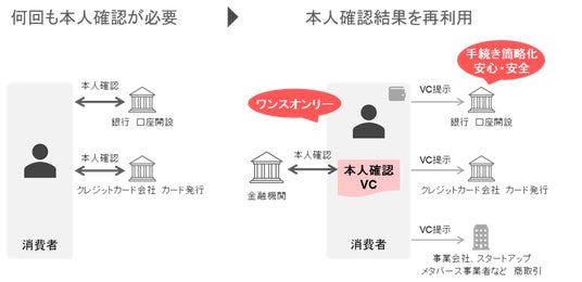 当該スキームが確立した場合、本人確認済VCによる本人確認手続きを簡略化できるほか、将来的にスタートアップ事業者、メタバース事業者等の様々な事業者に対し金融機関が本人確認機能を提供することができるようになり、デジタル空間(メタバース空間含む)において、安心・安全なPeer to Peerでの商取引が可能となります。