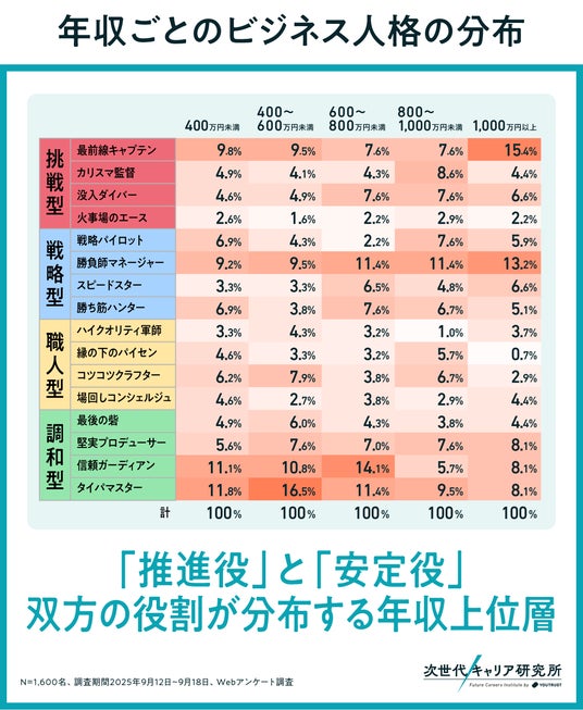 高年収帯(1,000万円以上)では、前線で成果責任を担う推進役タイプの比率が高まる傾向が見られました。