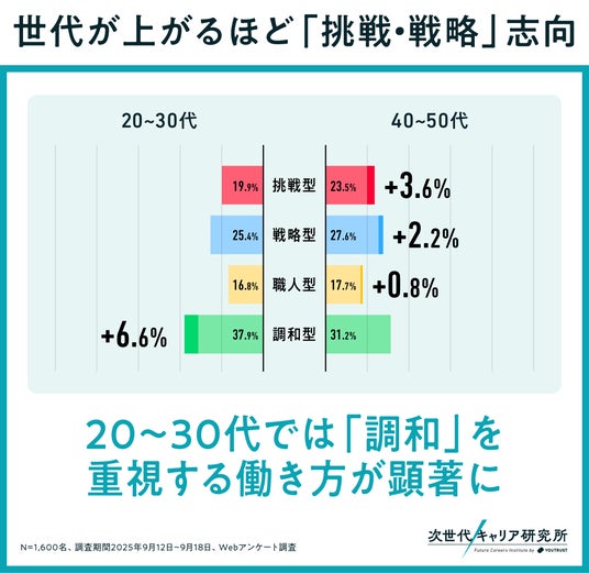 注目すべき点は、20~30代の若手層において「調和型」が最も多かった点です。