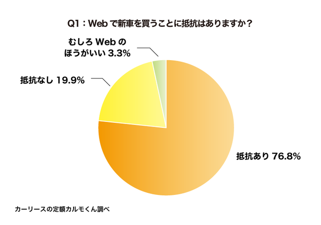 自家用車を持つ男女に対して、販売店に行かないで、Webで新車を買うことについて抵抗があるかを聞いたところ、最も多かったのは「抵抗あり」で76.8%。続いて、「抵抗なし」は19.9%、「むしろWebのほうがいい」は3.3%という結果になっています。