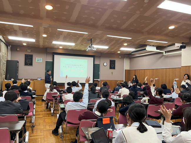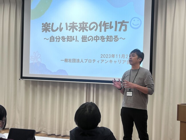 組織と個人のより良き関係性構築と個人の主体的なキャリア開発を支援する一般社団法人プロティアン・キャリア協会 (東京都新宿区、代表理事:田中研之輔・有山徹、以下、「当協会」)は、「現代版プロティアン・キャリア教育」授業を開発しています。2022年から始まり、約1800名以上の小・中・高・大学生に届けている自らの生き方・働き方をデザインする授業です。今回はサレジアン国際学園中学校の1年生約60名に向けて授業を実施しました。キャリア教育に力を入れているサレジアン国際学園中学校より「主体的な自己変革型キャリアを実際に歩んでいる方と交流する機会をつくりたい」とお声がけいただき、今回の実施となりました。
