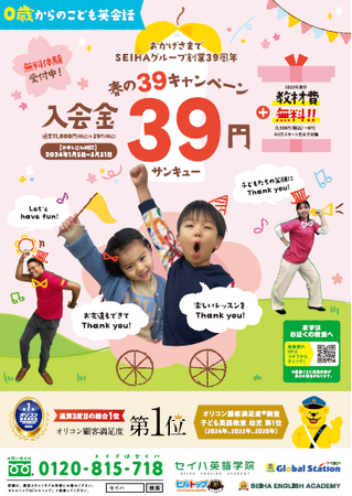 【セイハ英語学院】では、2024年1月5日~3月31日まで、ご入会いただくお客様に感謝の気持ちを込めて「春の39キャンペーン」を実施しております。