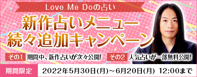 有名芸能人の結婚やスキャンダルから自然災害、政治・経済まで様々なニュースを的中させる『予言的中の占い師』Love Me Do。現在、月額公式サイト『ラブちゃん占い』にて、『Love Me Doの占い 新規占いメニュー続々追加キャンペーン』を開催中です。期間中、新作の占いメニューが続々追加されるほか、サイト内で人気の占いの一部鑑定項目が無料公開中となっております。ぜひこの機会にお試しください。
