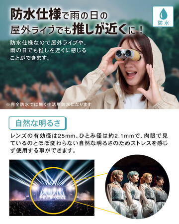 生活用防水設計ですので、ちょっとした小雨や水しぶきに対しても安心です。野外ライブ、アウトドア、バードウォッチングなど屋外でも安心してお使いいただけます。※本製品は完全防水ではありませんので、大雨時や水中での使用にはご注意ください。