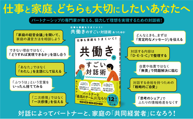 本書は、8万人以上の夫婦・カップルが利用する対話ツール「ふたり会議」の開発や、お互いを尊重しあうパートナーシップの築き方を学べるコミュニティ型スクール「ふたりの教室」を運営などで、多数メディアで注目される社会起業家のあつたゆかさんが、「仕事と家庭の両立」に悩むビジネスパーソンに向けて書いた自身初の書籍です。