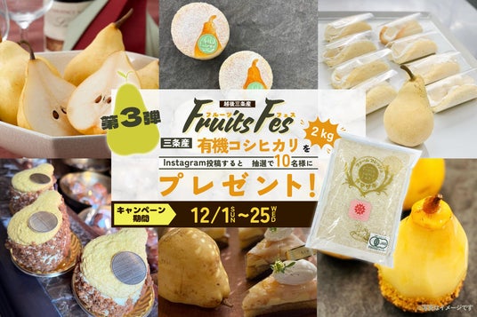 地域が誇る果物の魅力を発信するため、首都圏の人気パティスリーと連携し、旬の三条産果物を使った限定スイーツを販売する「季節のフルーツフェス」の 第3弾ル レクチエを、12 月1日からスタートします。スイーツの写真をInstagramに投稿すると抽選で三条産有機栽培コシヒカリが当たるプレゼント キャンペーンや、プレイベントのル レクチエ解禁記念コンサートも開催します。