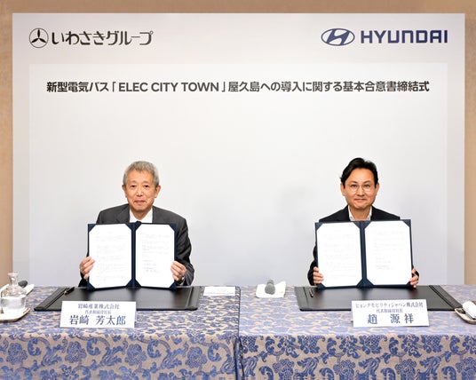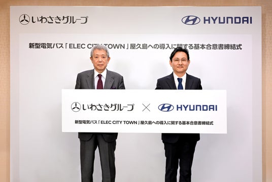 Hyundai Mobility Japan株式会社(本社:神奈川県横浜市西区、代表取締役社長:趙源祥、以下Hyundai)は、岩崎産業株式会社(本社:鹿児島県鹿児島市山下町、代表取締役:岩崎芳太郎、以下 いわさきグループ)との間で、鹿児島熊毛郡屋久島町(以下屋久島)での電気バス「ELEC CITY TOWN(エレク シティ タウン)」5台の販売に関する基本合意書を、2024年7月18日(木)に締結しました。
