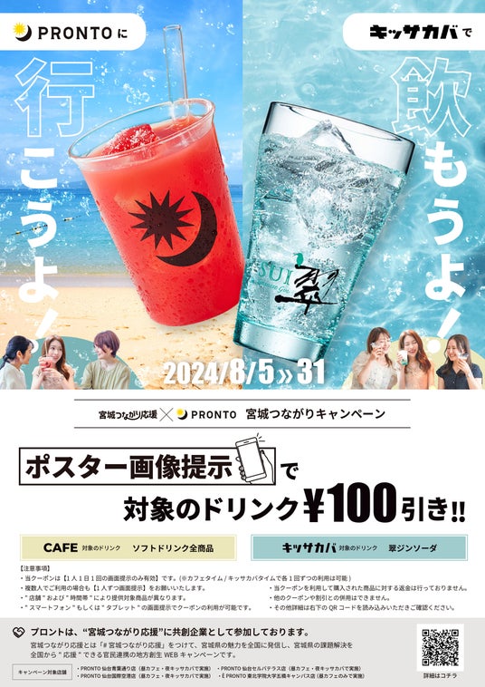 ポスター画像提示で対象のドリンクが100円引きになるキャンペーンを8月5日から開始いたします。プロントは「宮城つながり応援」に共創企業として参加しています。