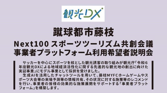 ・事業者プラットフォームでは、生成AIの活用により藤枝MYFC ホームゲームやスポーツ大会等の来場予測等の情報共有、およびそれらのデータや状況に対して事業者の収益最大化に繋がる施策の提案等を行い、持続可能な“稼ぐ観光スタイル”確立に繋ぎます。