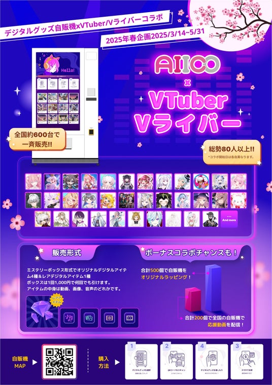 全国600箇所以上に展開中のデジタルグッズ販売が可能なサイネージ型IoT自動販売機「AIICO(アイコ)」においてVTuber/Vライバーとコラボしたデジタルグッズ販売が3月14日から開始されました。