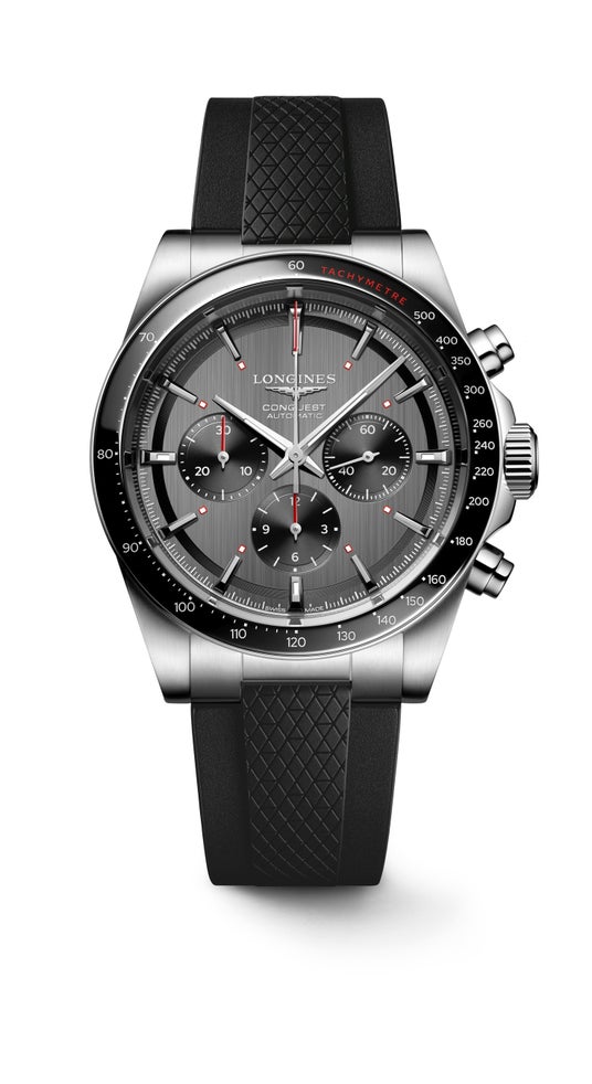 「コンクエスト クロノ スキー エディション」の42mmのステンレススティール製ケースは、ポリッシュ仕上げとサテン仕上げが交互に施されています。ブラックセラミックのインサートとタキメーターベゼルを備えたこのクロノグラフは、10気圧防水。風防には、多層無反射処理を両面に施したサファイアクリスタルを採用。3時位置のブラックのスモールセコンド、6時と9時位置のブラックのカウンターのコントラストがきいたアンスラサイトカラーのダイアルが特徴です。ダイアルには、コレクションの象徴的なデザインであるスネイル仕上げが施されています。3時、6時、9時、12時位置のアプライド・インデックス、ポリッシュ仕上げを施したロジウムカラーの時針と分針には、スーパールミノバ(R)が塗布されています。中央のクロノグラフ秒針の先端と、12時間積算計および30分積算計の針は、セラミック製ベゼルのタキメータースケールの一部と同じレッドカラーで、視認性を高めています。