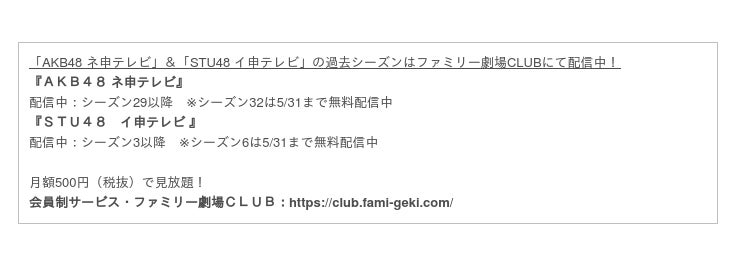 CS放送ファミリー劇場(運営:株式会社ファミリー劇場、所在地:東京都港区赤坂、代表取締役社長:服部洋之)は、オリジナル番組「AKB48 ネ申テレビ」および姉妹番組「STU48 イ申テレビ」によるSTAY HOME企画「#StayHome de ムチャぶり生配信」をファミリー劇場公式YouTubeチャンネルのYouTubeライブにて実施いたします(初回:5月24日(日)18:00~)。本企画は、 “おうち”から日本を元気にする“OUC48”プロジェクトとのコラボ企画として、メンバーはSTAY HOMEの状態でリモート出演します。ファンによるコメントからお題を決めたり、ファン参加型クイズを行うなどオンラインでのファンとの交流企画も。「AKB48 ネ申テレビ」と「STU48 イ申テレビ」が隔週ごとにYouTubeライブにて生配信を行い、生配信後はファミリー劇場CLUBにてアーカイブ配信をお楽しみいただけます。