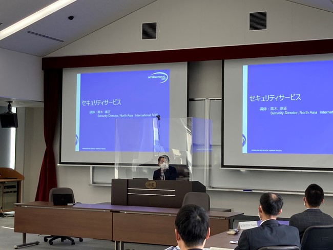 2022年2月 - 世界中で働く従業員の健康と安全を支えるためのソリューションを全世界のクライアントに提供するインターナショナルSOS(日本法人本社:東京都港区 代表取締役 マーク・アタウェイ)は、2022年1月25日、防衛省の防衛研究所 http://www.nids.mod.go.jp/ にて「民間企業による危機管理:インターナショナルSOSの業務解説」と題し、自衛隊の高級幹部候補の方へ民間企業がどのように医療とセキュリティのアシスタンスサービスを提供しているのかをお話させていただきました。この講義(セミナー)は、民間企業がどのように組織に対して健康面と安全面における危機管理サポートをさせていただいているのかを理解していただくことを目的に、自衛隊の高級幹部候補の方向けの授業の一環として、2013年より毎年1回開催されているものです。