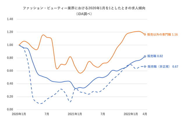 ファッション・ビューティー業界に特化した人材紹介を行う株式会社 iDA(アイ・ディ・エー、以下iDA / 本社:東京都渋谷区、代表取締役:堀井謙一郎)は、2022年5月度の調査としてファッション・ビューティー業界におけるコロナ前の2020年1月から2022年4月までの正社員転職市場動向と、非正規雇用での職種別の求人傾向をまとめました。