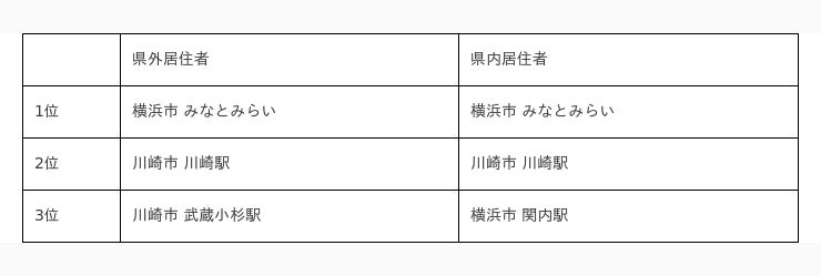 県外と県内ともに、横浜市や川崎市の観光地やターミナル駅が上位にランクインしていますが、県外居住者では藤沢市、県内居住者では横浜市の八景島シーパラダイスがランクインしていて、差が見られます。