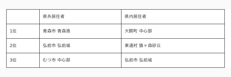 県外居住者では、青森市や弘前市、むつ市、八戸市などの観光地が上位にランクインしていますが、県内居住者では、大鰐町や東通村などの自然景勝地が上位にランクインしていて、差が見られます。