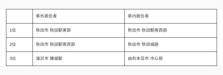 県外居住者では、秋田市や湯沢市、大館市などの観光地が上位にランクインしていますが、県内居住者では、由利本荘市や大館市郊外が上位にランクインしていて、差が見られます。
