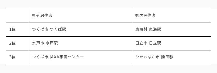県外居住者では、つくば市や東部沿岸部の地点が上位にランクインしていますが、県内居住者では、日立駅や勝田駅、水戸駅などの都市部周辺が上位にランクインしていて、差が見られます。