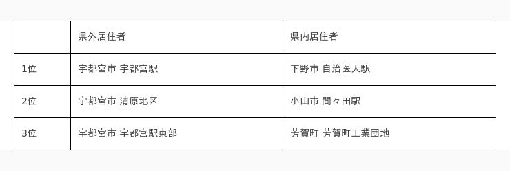 県外居住者では、宇都宮市中心部や日光市の観光地の地点が上位にランクインしていますが、県内居住者では、宇都宮市郊外エリアが上位にランクインしていて、差が見られます。