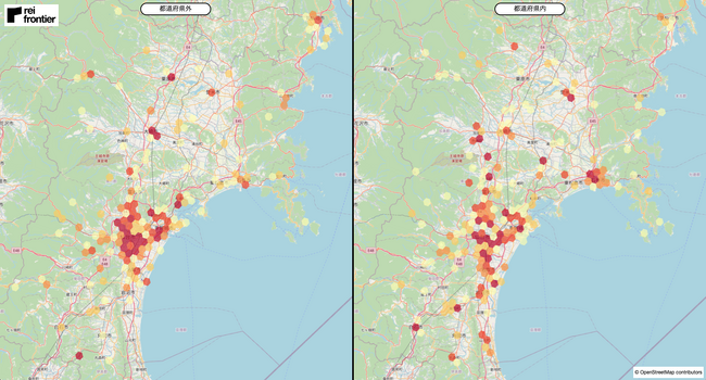 県外在住者では、仙台市を中心とするエリア、松島町や大崎市、栗原市などにヒートマップの濃い地点が存在しています。一方で、県内在住者では、仙台市郊外のエリア、白石市や石巻市、登米市にヒートマップの濃い地点が存在しています。
