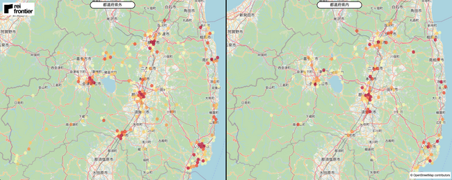 県外在住者では、福島市、会津若松市や白河市、いわき市などにヒートマップの濃い地点が存在しています。一方で、県内在住者では、須賀川市や本宮市、二本松市などにヒートマップの濃い地点が存在しています。