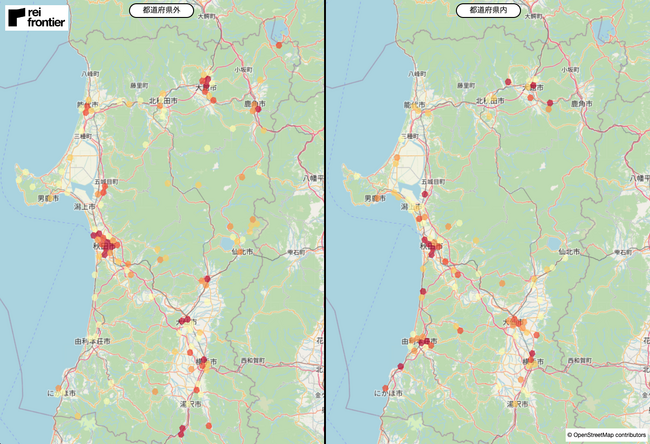 県外在住者では、秋田市や大館市、鹿角市、大仙市、湯沢市などにヒートマップの濃い地点が存在しています。一方で、県内在住者では、由利本荘市などの西側沿岸部にヒートマップの濃い地点が存在しています。