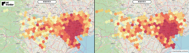 都外在住者では、山手線内から東海道線のエリア、羽田空港にヒートマップの濃い地点が存在しています。一方で、都内在住者では、ヒートマップの色の濃い地点は都外在住者と変わらないものの、奥多摩地域にも人流があり、ヒートマップの濃い地点が存在しています。