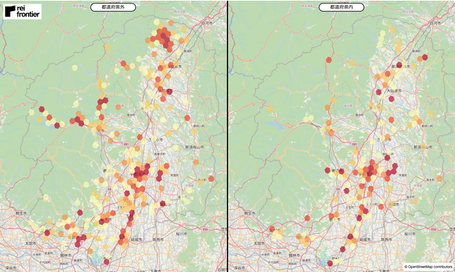 県外在住者では、草津町や嬬恋村、沼田市、桐生市などにヒートマップの濃い地点が存在しています。一方で、県内在住者では、高崎市や前橋市、伊勢崎市の郊外エリア、安中市にヒートマップの濃い地点が存在しています。