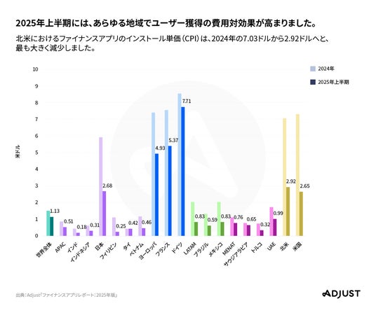 - 2025年上半期にはユーザー獲得の費用対効果が向上し、ファイナンスアプリのインストール単価(CPI)は1.51ドルから1.13ドルに低下しました。インストール単価の下落幅が最も大きかったのは北米地域で、2024年の7.03ドルから2.92ドルへ減少しています。