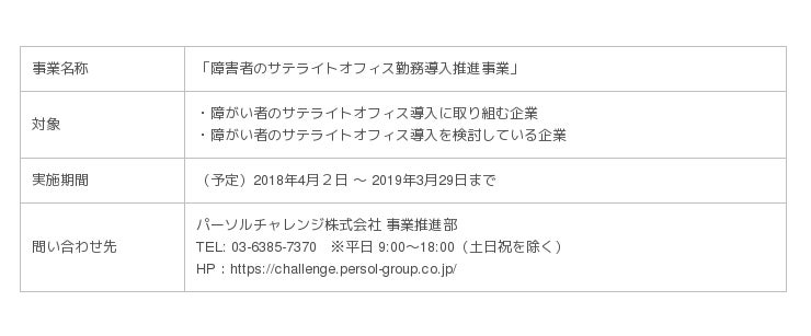 総合人材サービスのパーソルホールディングス株式会社(本社:東京都渋谷区、代表取締役社長 CEO:水田 正道)で障がい者雇用支援事業を手掛ける特例子会社、パーソルチャレンジ株式会社(本社:東京都港区、代表取締役:原野 司郎、以下パーソルチャレンジ)は、本日2018年4月2日に厚生労働省から「障害者のサテライトオフィス勤務導入推進事業」を受託いたしました。
