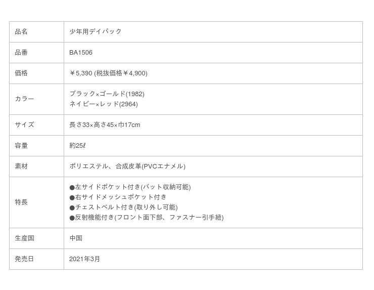 【少年用デイパック BA1506】は便利で使いやすく少年プレーヤーも大満足!