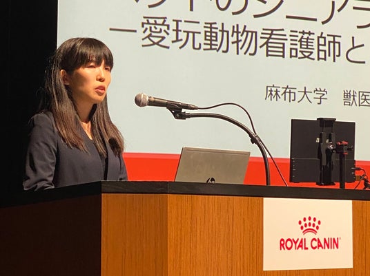 歩行や食事をはじめとした普段の生活の中で、中高齢期のペットの身体や認知機能に起こる事象や介助のポイントについて詳しく解説し、ペットが失敗しづらい生活環境をつくることの重要性について紹介しました。また、動物病院に求められることとして人間同様にバリアフリーの環境をつくるなど、中高齢期になってもまっすぐ素直に生きるペットと家族に対し、適切な看護を実践するために愛玩動物看護師の視点から、ご自身の臨床経験と研究結果をもとに必要な知識や工夫を紹介しました。