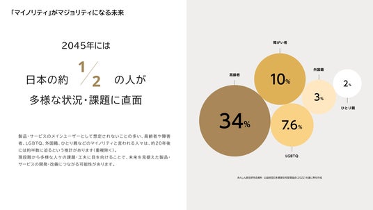 製品・サービスのメインユーザーとして想定されないことの多い、高齢者や障害者、LGBTQ、外国籍、ひとり親などのマイノリティと言われる人々は、約20年後には約半数に迫るという推計があります(重複除く)。