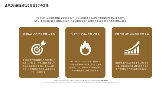 マッキンゼーによれば、共創のプロセスがイノベーションの成功を引き上げる可能性はわずか4%にすぎません。しかし、欧州3ヵ国300社を調査したところ、共創を成功させている企業の特徴として3つの共通点を発見しました。