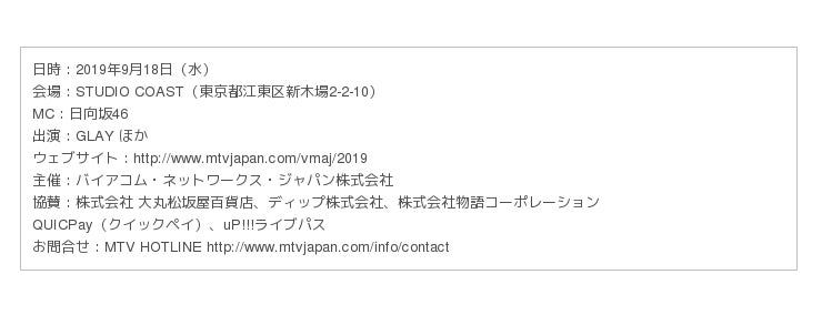 世界最大級のユース向け音楽&エンターテインメント・ブランド「MTV」を日本で展開するバイアコム・ネットワークス・ジャパン株式会社(東京都港区、代表取締役社長:井股進)は、9月18日(水)に開催するスペシャルイベント「MTV VMAJ 2019-THE LIVE-」に、GLAYの出演が決定したことを発表しました。