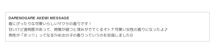ダレノガレ明美プロデュース香水の第3弾は、出会いが多く、恋の季節と呼ばれる春にぴったりなサクラの香りで開発しました。女の子の魅力をアップする、甘くて可愛らしいサクラの香りに仕上がっています。