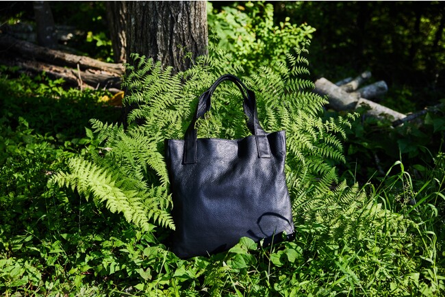 松山さんがデザインを手がけたトートバッグは、ご自身が使用するガーメントケースからインスピレーションを得て制作されました。メインで使用しているのは、アップサイクルされた鹿革。軽量で柔らかな質感の鹿革を、和光と長年付き合いのあるジャパンブランド「ボーデッサン」の精緻な職人技によって、上質なトートバッグに仕上げました。