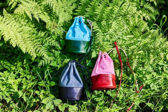 巾着型のコンパクトなバッグは、小雪さんのアイディアで制作されました。ショルダーストラップを外すと手提げバッグとポーチとしても使用できたり、ピンクや水色といった鮮やかな発色をセレクトしたりと、使い勝手とデザイン性を両立できるよう仕上げました。