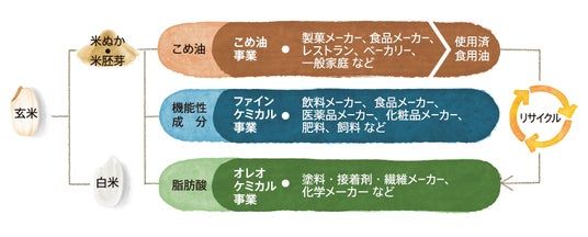 築野食品のこめ油と米ぬか由来製品 築野食品工業は長年、こめ油の原料である米ぬかの成分に着目し、研究を進めてまいりました。精米時に発生する副産物である米ぬかの成分を抽出することで、こめ油だけでなく食品、化学、医療、化粧品等の幅広い分野への高度有効利用をし、米ぬかの100%活用をしています。今後も国内の米ぬかを活用することで地球・生産者・消費者の良い循環の実現を目指していきたいと考えています。