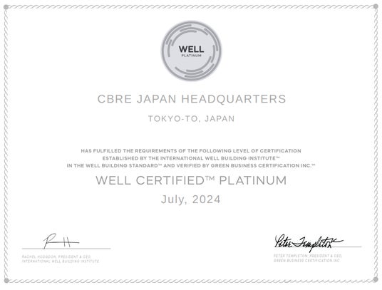 CBRE(日本本社:東京都千代田区丸の内)は、このたび、CBRE東京本社オフィスにおいて、「WELL Building Standard(TM) v2 (以下、WELL認証)」の最高ランク「プラチナ」を取得したことをお知らせいたします。