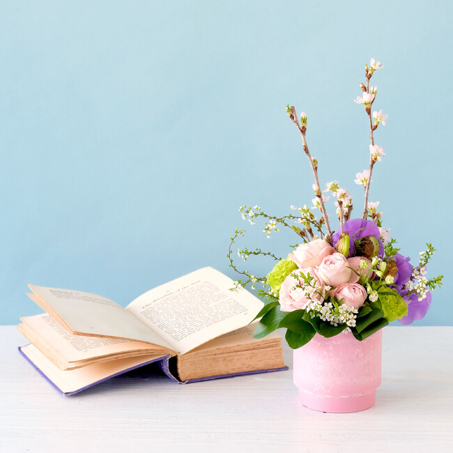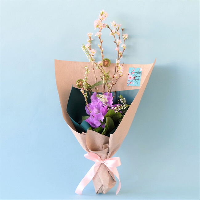 ぎゅっと詰め込んだ季節の花々と伸びやかな桜のコントラストが美しいアレンジメント。ギフトやご自宅用にもおすすめです。