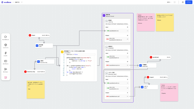 エクサウィザーズは企業ユーザーがAIソフトウェアを容易に開発できる「exaBase Studio」を今期(2024年3月期)中に投入予定です。exaBase Studioではキャンバスと呼ぶ開発画面に、AIアルゴリズムや処理、入力データなどを定義できるソフトウェア開発環境です。キャンバスを利用して、ビジネス部門の担当者とエンジニア・開発者などのステークホルダーが目標を共有しながら、アジャイル型で迅速に構築し、その後の環境変化に応じて進化させることもできます。
