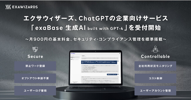 株式会社エクサウィザーズ(東京都港区、代表取締役社長:春田 真、以下、エクサウィザーズ)は、企業向けの生成・対話型AIサービス「exaBase 生成AI built with GPT-4」の予約受付を開始いたしました。どのような企業でも安全に生成・対話型AIを本格的に利用できるように、「ChatGPT」の課題とされるセキュリティの確保やコンプライアンス遵守の機能を標準で搭載いたします。