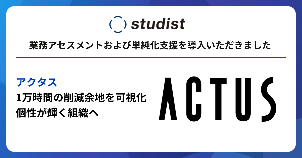 リーンオペレーションの実現を支援する株式会社スタディスト(本社:東京都千代田区、代表取締役CEO:鈴木悟史、以下「スタディスト」)は、輸入家具・雑貨等の小売・卸売・法人事業を展開する株式会社アクタス(本社:東京都新宿区、代表取締役社長:村田 謙、以下「アクタス」)における業務アセスメント・単純化支援の活用事例とその成果を発表いたします。