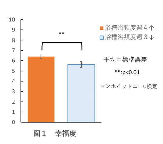 株式会社バスクリン(本社:東京都千代田区 社長:三枚堂正悟)は、東京都市大学人間科学部 学部長 早坂信哉教授の研究グループと共同で、全国の20-60歳の調査参加に同意を得られた300名を対象に2022年12月にweb調査による自記式横断研究を実施しました。浴槽入浴の頻度が週 4 回以上の群(以下:高頻度群)と、週 3 回以下の群(以下:低頻度群)の 2 群に分けて解析を行いました。高頻度群では、低頻度群と比較して、幸福度、主観的健康感、睡眠の満足感が高い傾向にあり、特に幸福度は有意に高いことがわかりました。また、高頻度群は入浴条件(湯温や入浴時間など)についての意識も高く、健康診断において指摘事項が無い方の割合も多い傾向にありました。