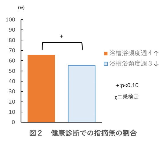 解析方法:浴槽入浴とQOL、健康状況(健康診断での指摘等)との関連について、浴槽浴頻度を高頻度(週4回以上)、低頻度(週3回以下)の2群に分け、その背景因子について解析しました。